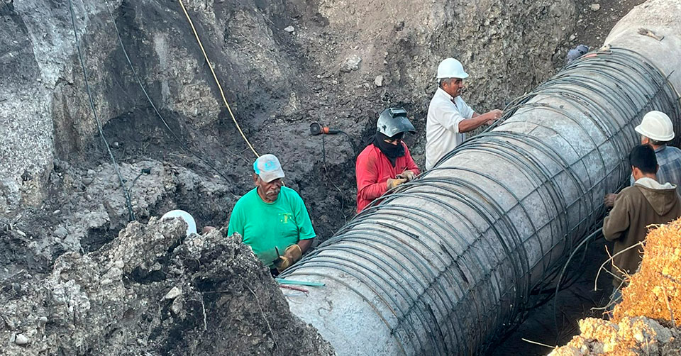 Ciudad Victoria, Tamaulipas. – Trabajadores de la Comisión Municipal de Agua Potable y Alcantarillado (Comapa) en Ciudad Victoria, intensificaron los trabajos de reparación de fuga en una tubería de concreto de 36 pulgadas en el acueducto Guadalupe Victoria.