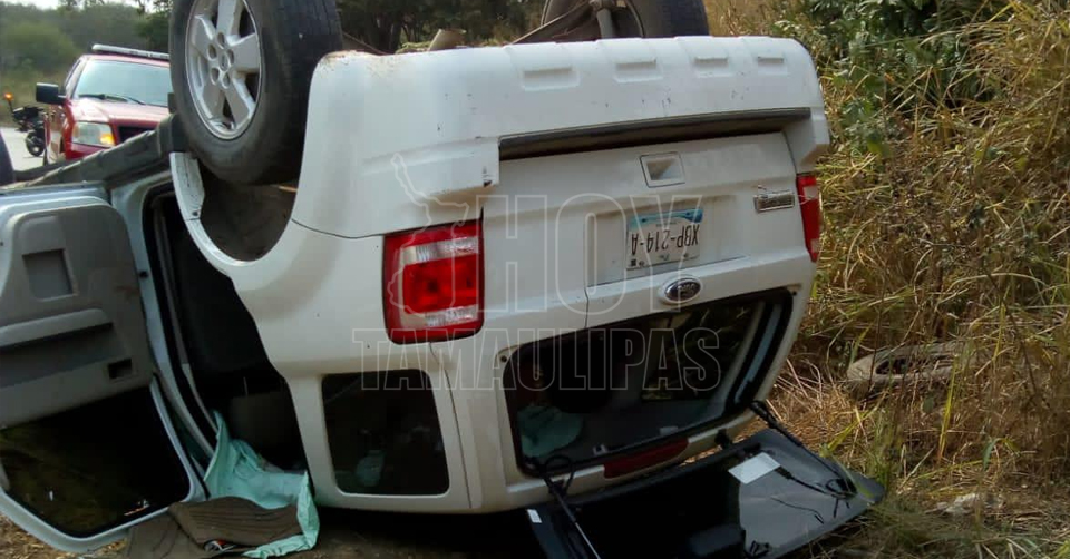 Se trata de una camioneta de la marca Ford Escape en color blanco modelo 2014, con placas del estado de Tamaulipas quedando la unidad con las llantas hacia arriba y en el barranco.