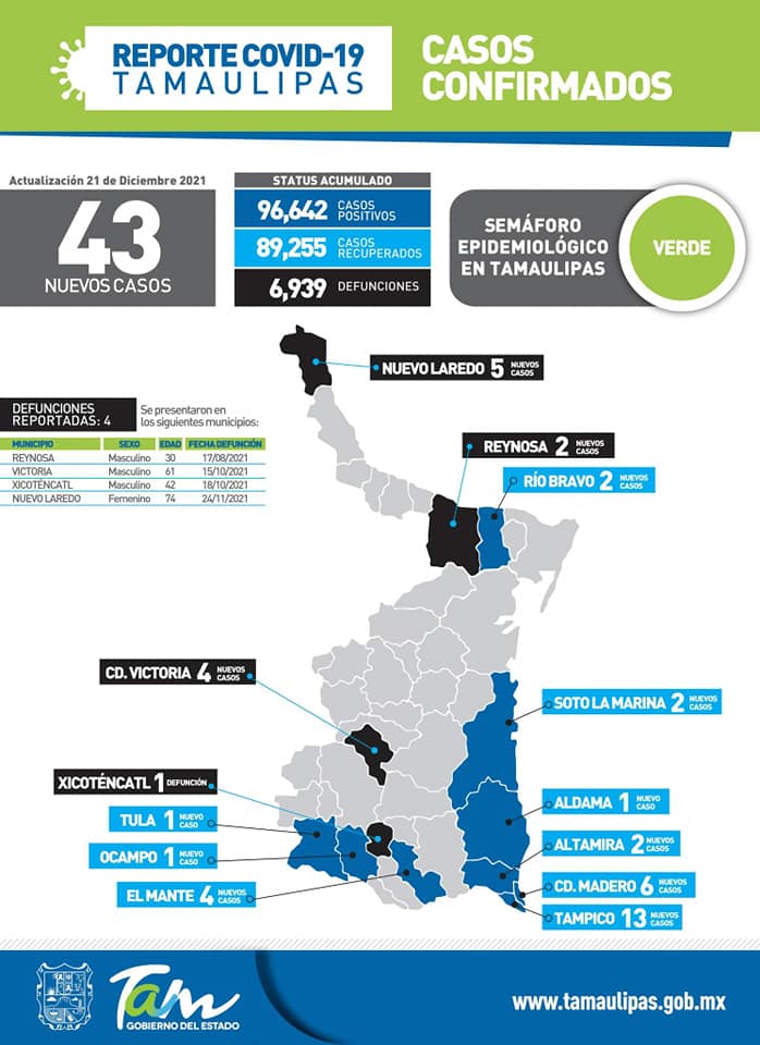 Ciudad Victoria, Tamaulipas.- Este martes se registraron en Tamaulipas 43 nuevos contagios de Covid-19 y cuatro muertes por complicaciones derivadas de la enfermedad, informó la Secretaría de Salud Estatal.