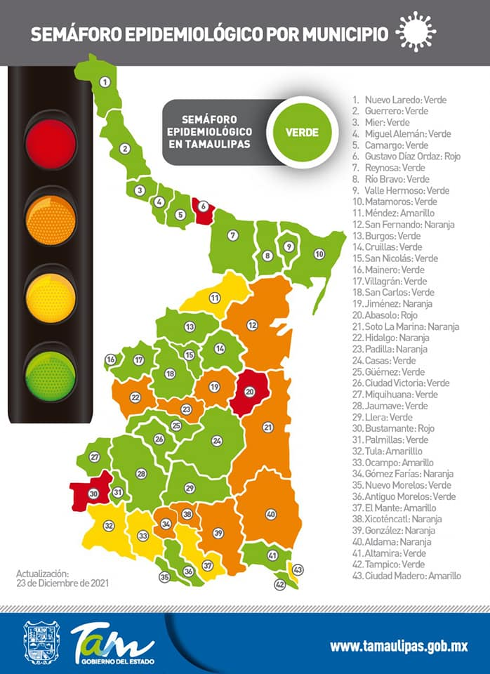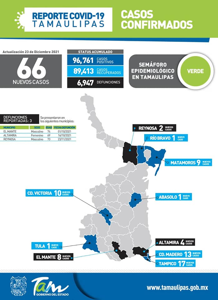 Mientras que los fallecimientos corresponden a un hombre de 74 años en El Mante, una mujer de 69 años en Altamira y un hombre de 73 años en Reynosa.