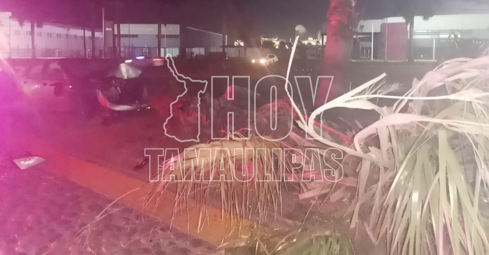 Se trata de un carro de la marca Ford Focus en color arena con placas de Tamaulipas, mismo que quedó completamente destrozado de su parte frontal, ante el fuerte impacto contra la palmera propiedad de la administración del Fraccionamiento en mención.