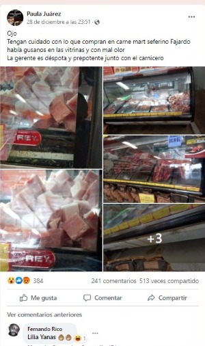 “Tengan cuidado con lo que compran en Carne Mart Zeferino Fajardo había gusanos en las vitrinas y con mal olor, la gerente es déspota y prepotente junto con el carnicero”, se leía en la publicación.
