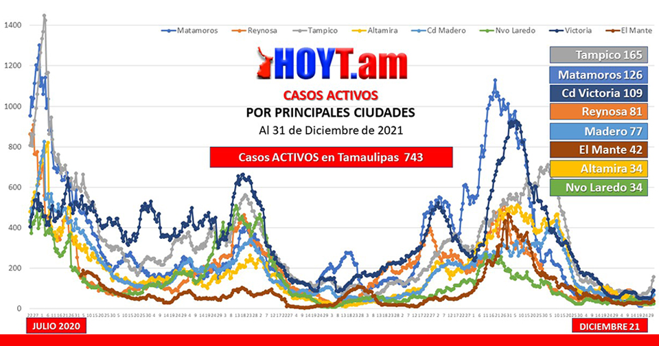 Ciudad Victoria, Tamaulipas.- Durante el 2021, un total de 56 mil 933 tamaulipecos se contagiaron de Coronavirus Covid-19 y 3 mil 620 fallecieron a consecuencia de las complicaciones de la enfermedad; en sus últimos días se tuvo un repunte con nuevas infecciones y con ello el fantasma de una cuarta ola recorre al Estado y al país.