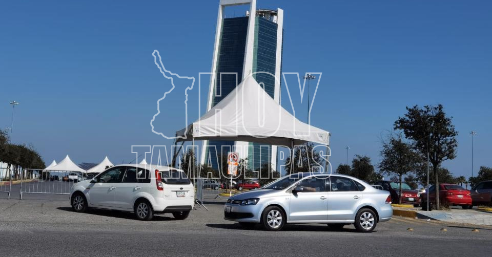 Ciudad Victoria, Tamaulipas. - En la sede de vacunación contra la Covid-19 ubicada en el estacionamiento del Polyforum de Ciudad Victoria se registra poca afluencia de vehículos.