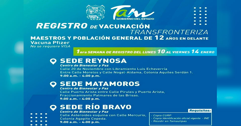 Ciudad Victoria, Tamaulipas. - El registro de vacunación transfronteriza con el que el gobierno estatal llevará a niños mayores de 12 años, maestros y población en general a vacunar al Estado de Texas, se realizará a partir del próximo lunes 10 y hasta el 14 de enero, informó el gobernador de Tamaulipas, Francisco García Cabeza de Vaca.