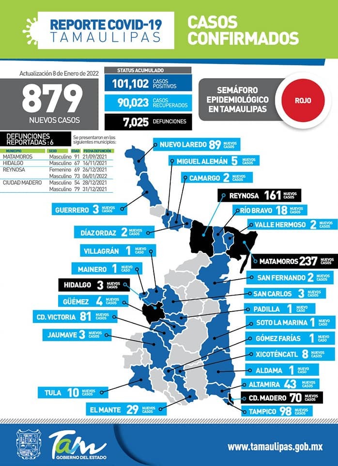 Ciudad Victoria, Tamaulipas.- Un total de 879 casos nuevos de Covid-19 y seis muertes por complicaciones derivadas de la enfermedad se reportaron este día en Tamaulipas, volviendo la entidad a semáforo epidemiológico rojo, confirmó la Secretaría de Salud Estatal.