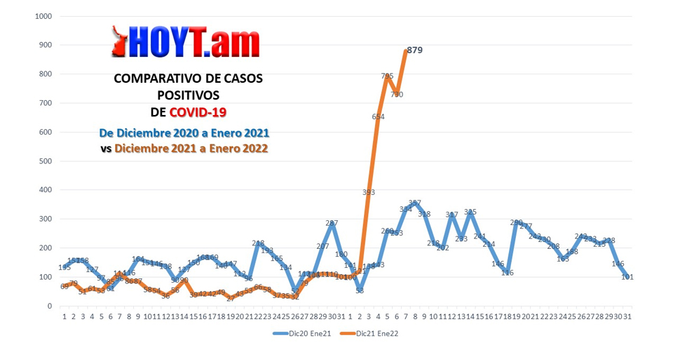 El primer gráfico muestra el comparativo de casos positivos de Covid-19 en el periodo Diciembre 2020 – Enero 2021 y Diciembre 2021 – Enero 2022, donde se puede observar cómo se dispararon considerablemente los contagios.