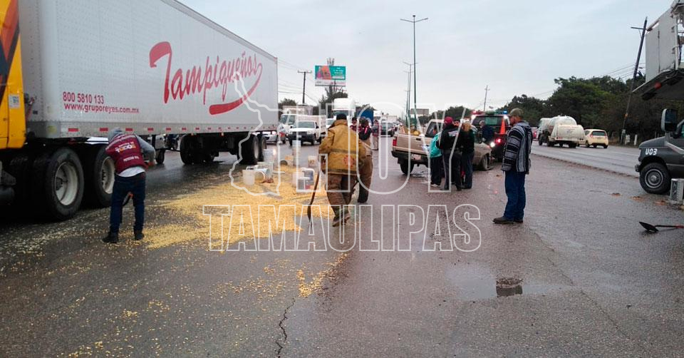 En la caja de la camioneta Pick Up iba cargada con maíz, el cual quedó esparcido en la carpeta de rodamiento.