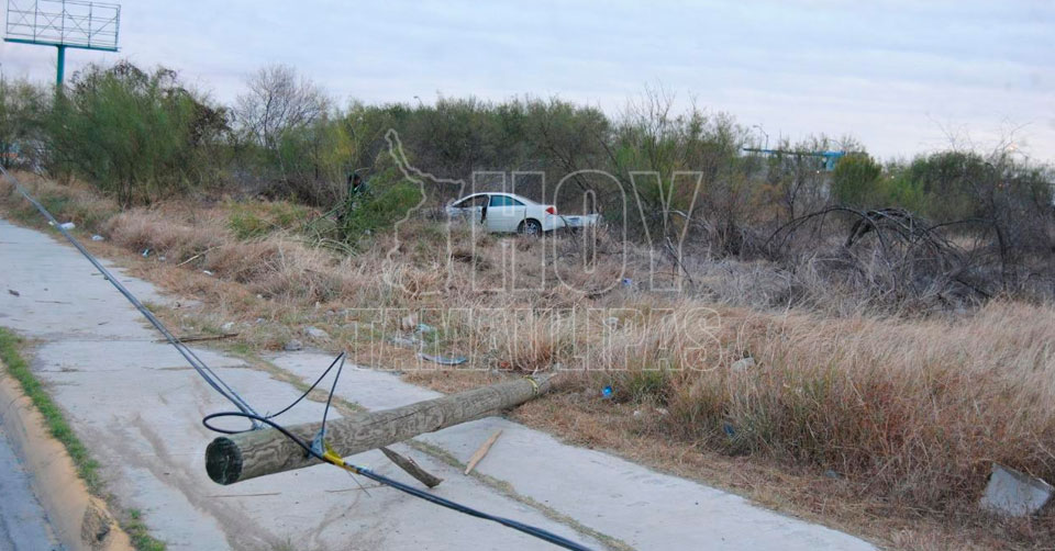 Nuevo Laredo, Tamaulipas. - Por viajar con exceso de velocidad, una persona perdió el control de su unidad, se salió del camino y se llevó de encuentro un poste de madera que destruyó, en Nuevo Laredo.
