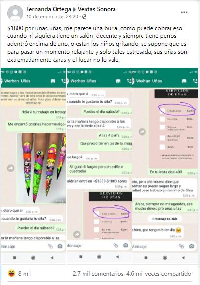 “$1, 800 por unas uñas, me parece una burla, como puede cobrar eso cuando ni siquiera tiene un salón decente y siempre tiene perros adentro encima de uno, o están los niños gritando”, se lee en la publicación de Facebook.