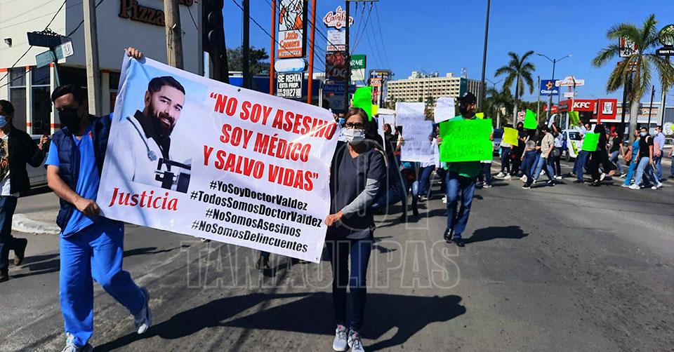 Tampico, Tamaulipas. - Cerca de 80 trabajadores de la salud, de hospitales públicos y privados, volvieron a manifestarse en apoyo del médico Roberto "N", luego que fue anunciado que se le vinculó a proceso por la presunta comisión de tres delitos, por lo que en la manifestación que abarcó desde la Avenida Marqués de Guadalupe hasta Ejército Mexicano por toda la Miguel Hidalgo, los galenos exigieron su pronta liberación.