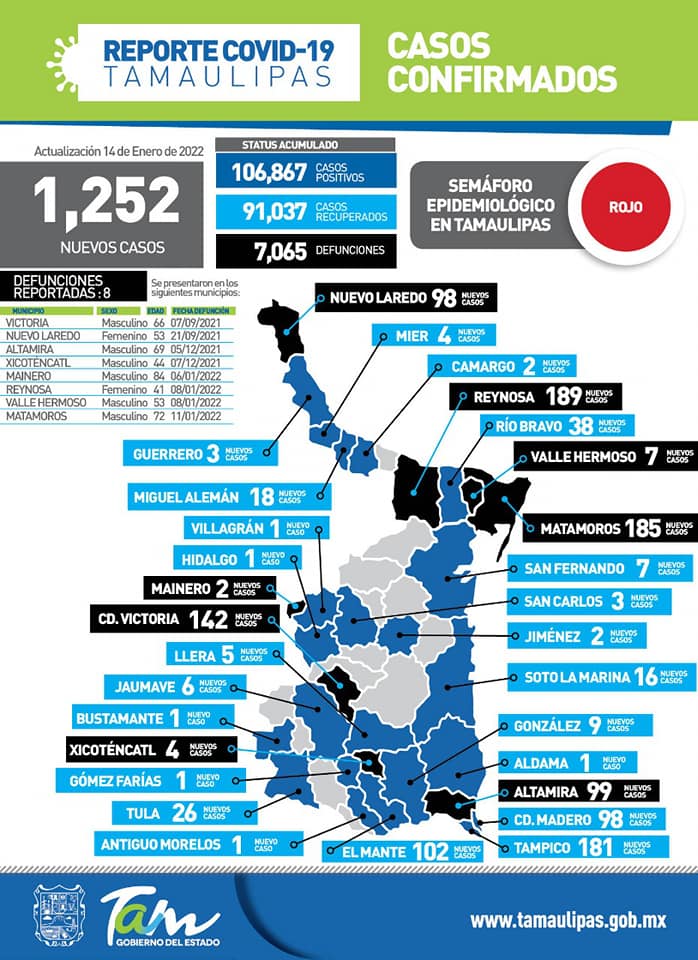 Desde el inicio de la pandemia hasta el día de hoy viernes 14 de enero del 2022 en Tamaulipas se han acumulado 106 mil 867 casos positivos, de los cuales se han recuperado 91 mil 037 y han fallecido siete mil 065, según informó la Secretaría de Salud.