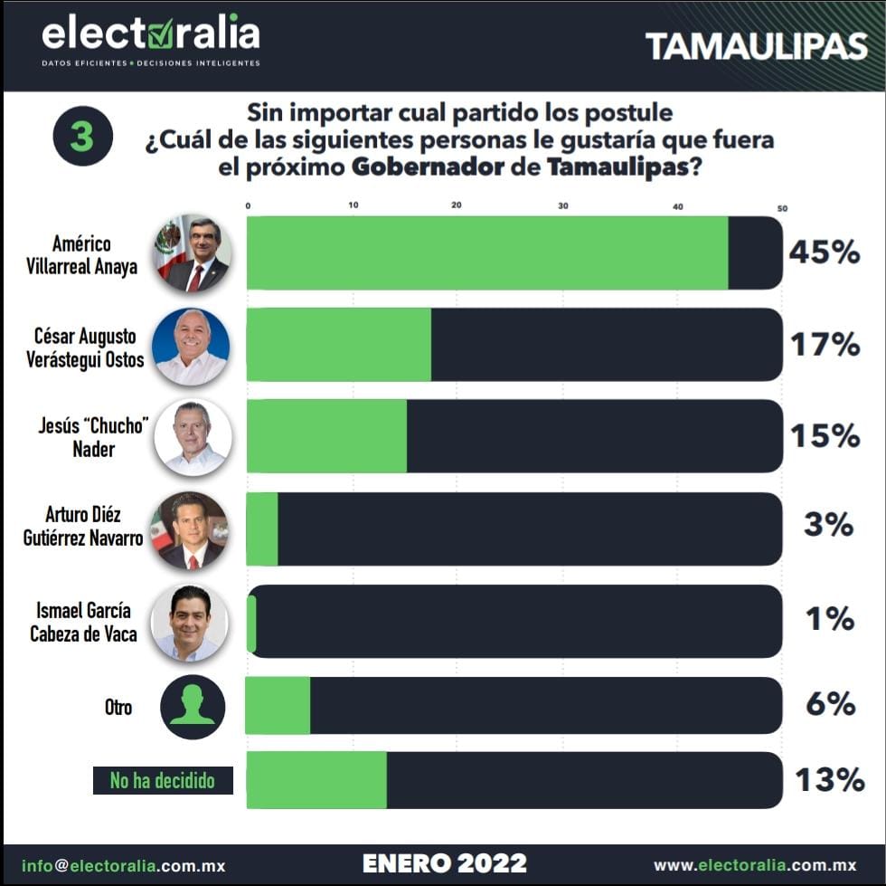 El exsenador obtuvo una intención del voto del 45 por ciento de las personas encuestadas, mientras que el precandidato de la alianza "Va por Tamaulipas", César Verástegui Ostos consiguió un 17 por ciento, y por debajo de él con un 15 por ciento el alcalde de Tampico, Jesús Nader.
