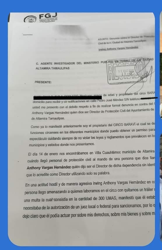 Y es que el 14 de enero del 2022 se presentó en el lugar que pretendían instalar el circo BARAVI, notificando solamente de palabra que contaba con una denuncia en contra del propietario del circo, por lo que no podía trabajar.