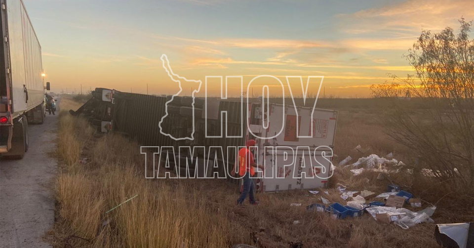 La volcadura del tráiler sucedió en el Kilómetro 23 más 900 del mencionado Libramiento, que conecta al Puente III del Comercio Mundial de Laredo, Texas y esta frontera.