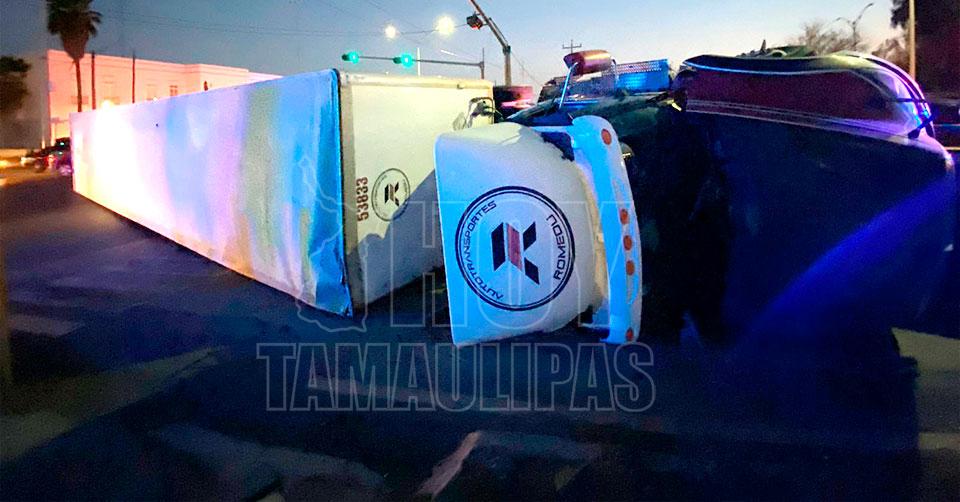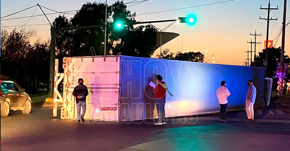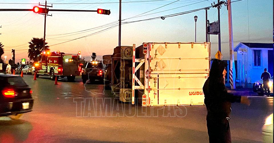 Matamoros, Tamaulipas.- Un tráiler de la empresa Romedu volcó en el Periférico y González, lo que originó afectaciones al tráfico en una de las zonas más transitadas por su conexión con el centro y las maquiladoras.