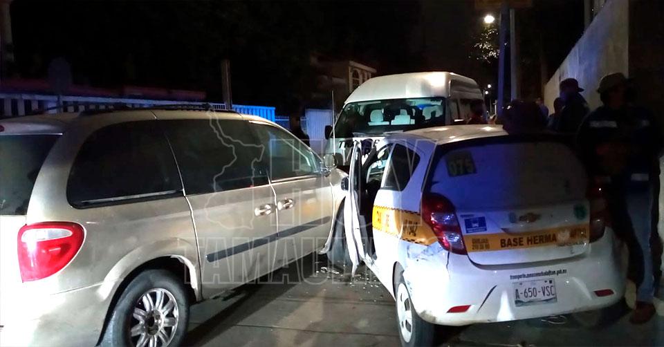 El taxi era conducido de poniente a oriente por la Buenos Aires e hizo un alto en el cruce, sin embargo, la camioneta Caravan eran conducida a exceso de velocidad de sur a norte por la Juan Aldama impactando al taxi, saliendo ambos proyectados hacia el norte impactando la parte frontal de la camioneta de transporte de personal.