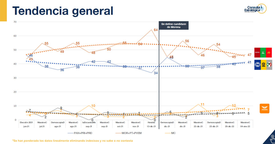 Cabe destacar que, a principios de diciembre de 2021, Morena y aliados contaba con el 64% de las preferencias, mientras que el PAN se ubicaba en el 34 por ciento.