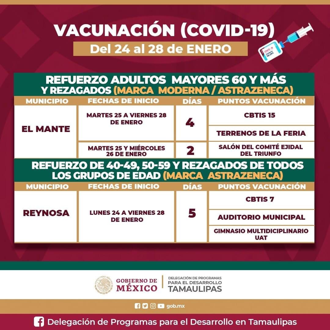 En la misma fecha, se aplicará en Reynosa el refuerzo para personas desde 40 hasta más de 60 años de edad con la marca AstraZeneca en el Cbtis 7, Auditorio Municipal y Gimnasio Multidisciplinario de la UAT.