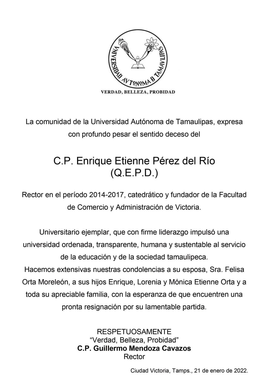 Ciudad Victoria, Tamaulipas.- Enrique Etienne Pérez del Río, ex rector de la Universidad Autónoma de Tamaulipas (UAT), falleció esta tarde.