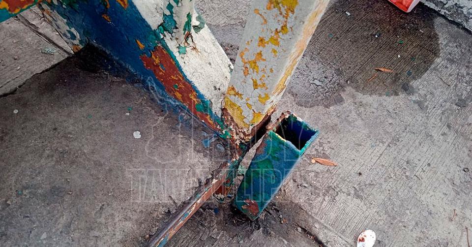 Nuevo Laredo, Tamaulipas.- La base de la escalera del puente peatonal de Soriana Reforma en Nuevo Laredo, se encuentra suelta y tiembla cuando los ciudadanos que cruzan la transitada Avenida Reforma pasan por este tramo.
