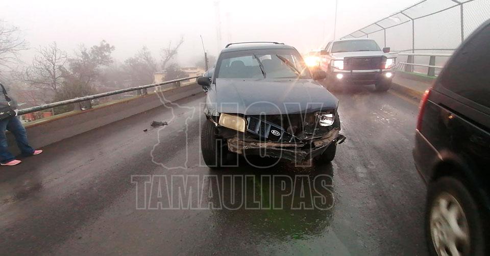 Nuevo Laredo, Tamaulipas.- Una mujer provocó un accidente en la parte alta del puente vehicular, en Nuevo Laredo, luego de que cambió de dirección sin precaución.