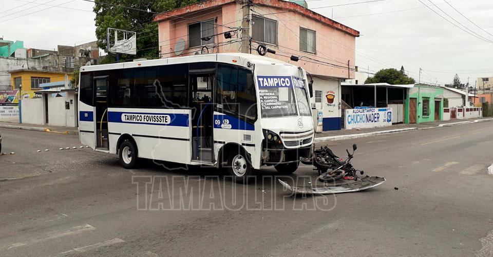 Las unidades involucradas son un microbús de la ruta Tampico Fovissste y una moto en color negro con rojo.