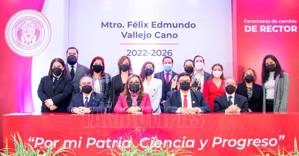 Tampico, Tamaulipas. - En una ceremonia solemne, la Universidad del Noreste en Tampico llevó a cabo el nombramiento oficial de su nuevo rector, Félix Edmundo Vallejo Cano, quien sustituye a Lilia Velazco Del Ángel.