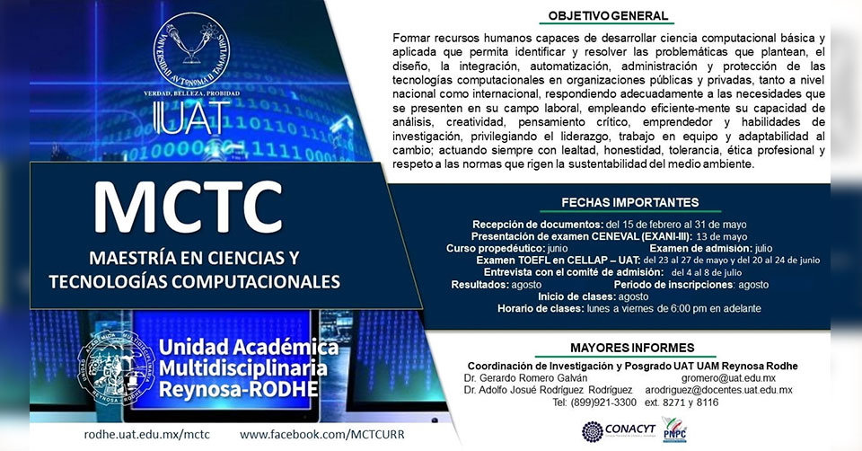 Ciudad Victoria, Tamaulipas. - La Maestría en Ciencias y Tecnologías Computacionales que imparte la Universidad Autónoma de Tamaulipas (UAT) en la Unidad Académica Multidisciplinaria Reynosa Rodhe (UAMRR) obtuvo la renovación de su acreditación por el Programa Nacional de Posgrados de Calidad (PNPC).