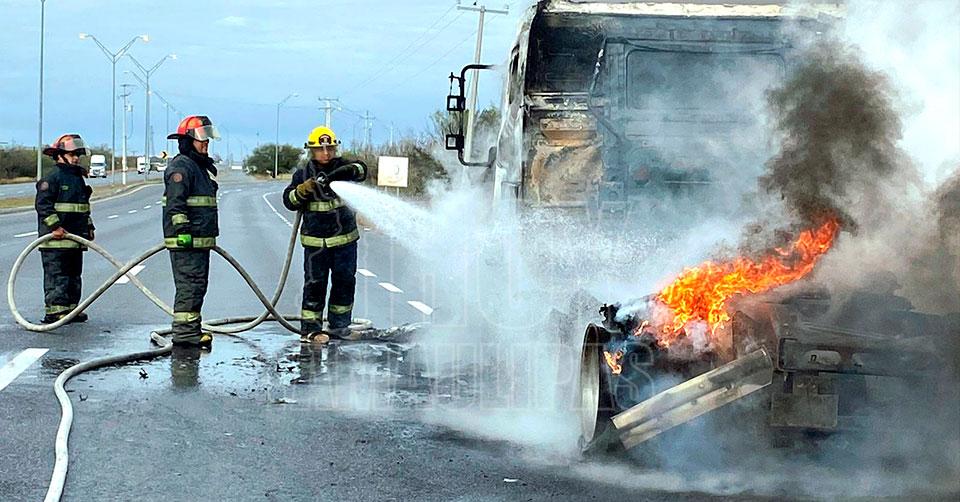 Tras varios minutos de lucha, los bomberos controlaron el incendio en el pesado vehículo y en la maleza, reportando daños materiales totales en la unidad.