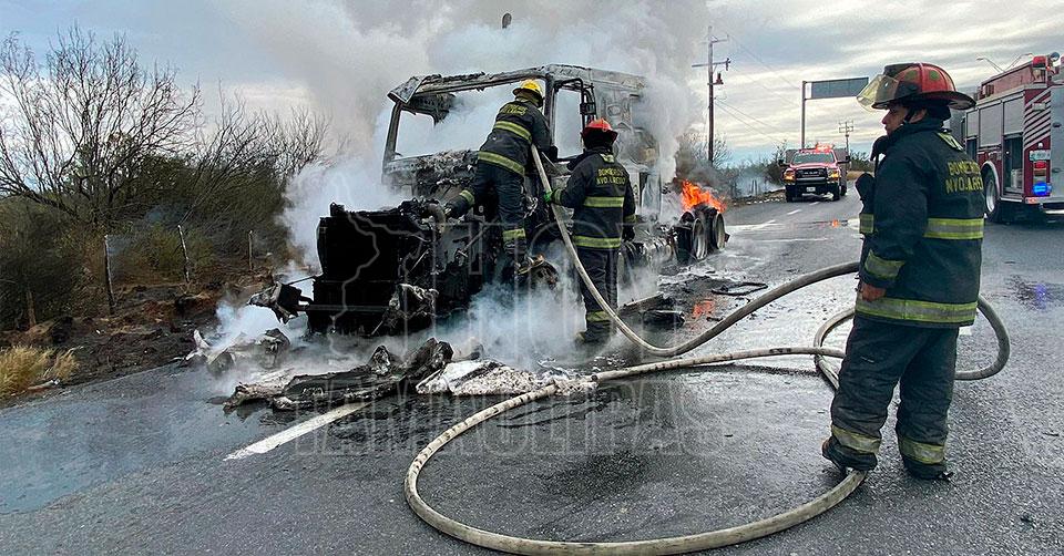 Nuevo Laredo, Tamaulipas.- Un tráiler quedó reducido a “cenizas” al incendiarse probablemente por un cortocircuito en la Carretera Nacional, al sur de Nuevo Laredo.