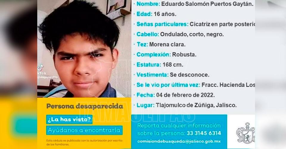 Guadalajara, Jal; (Agencia Informativa de México).- Eduardo Salomón, de 16 años de edad, quien fue reportado por sus padres como privado de la libertad por varios sujetos armados que ingresaron a su domicilio en Tlajomulco, fue localizado sin vida en una vivienda del centro del mencionado municipio.