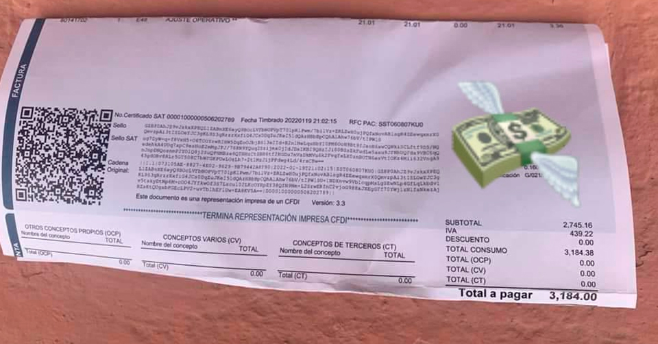 “Apoyo comunitario para pagar el recibo del Gas Naturgy”, dijo en tono de broma mostrando el recibo de tres mil 184 pesos que le están cobrando.