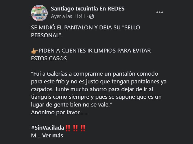 “Fui a Galerías (plaza comercial) a comprarme un pantalón cómodo para este frío y no es justo que tengan pantalones ya cagados”, fue el testimonio.