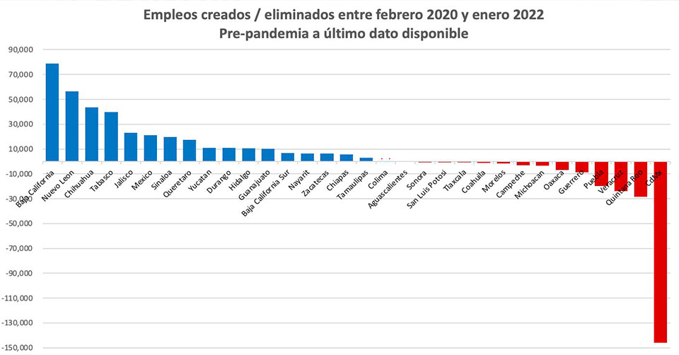 De los estados que entre 2020 y enero del 2022, más empleos continuaron con pérdidas, lo encabeza la CdMx con -148 mil, Quintana Roo con -29 mil y Veracruz con -20 mil empleos perdidos (eliminados).