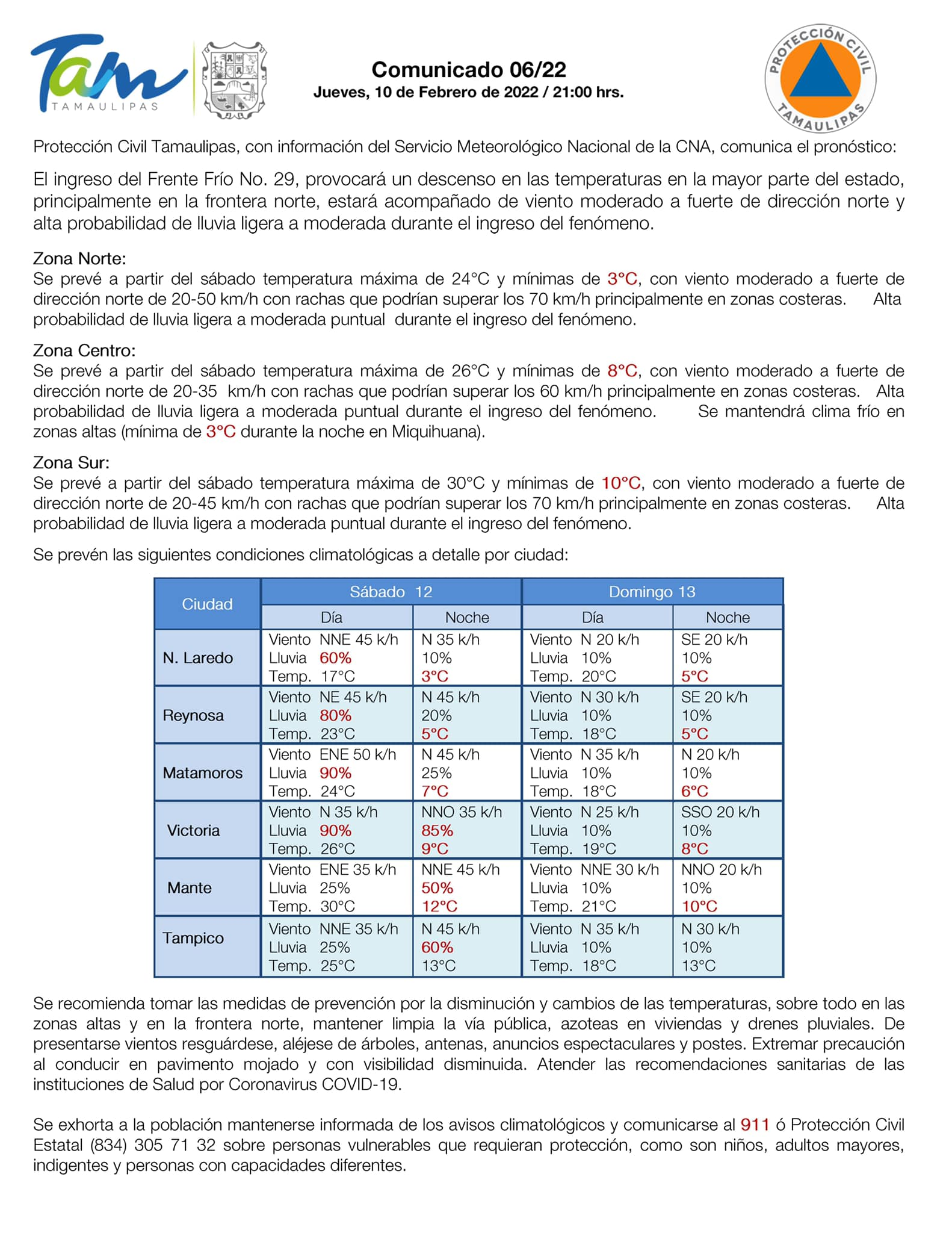 Para Ciudad Victoria y sus alrededores se pronostica para mañana sábado y el domingo una mínima de ocho grados y una máxima de 26, con viento moderado a fuerte de dirección norte de 20 a 35 kilómetros por hora y alta probabilidad de lluvia ligera a moderada puntual.