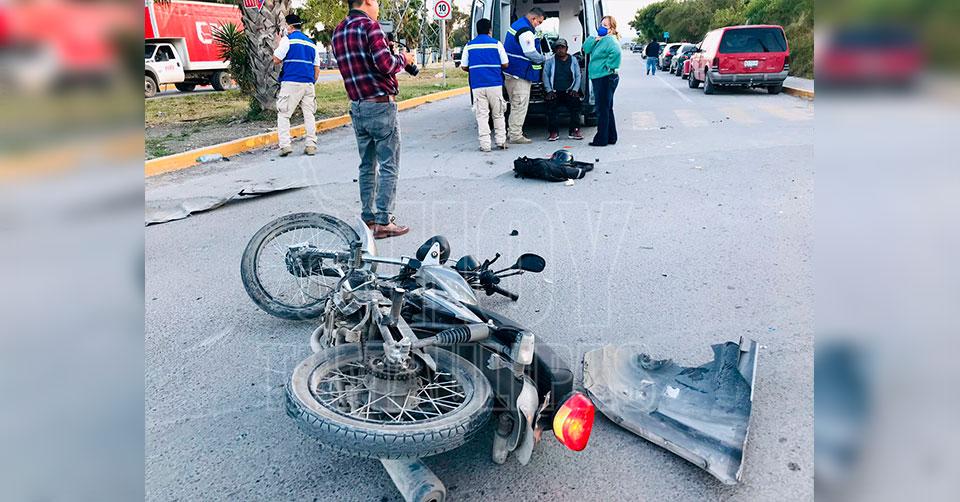 Ciudad Victoria, Tamaulipas. – Un motociclista repartidor resultó lesionado esta tarde luego de ser derribado de la unidad que tripulaba por una camioneta, en la Avenida las Torres con Avenida Las Américas de la colonia México.