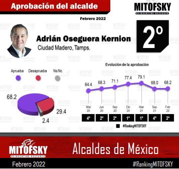 Ciudad Victoria, Tamaulipas. – El alcalde de Ciudad Madero, Adrián Oseguera Kernion fue calificado como el segundo mejor presidente municipal en todo el país, de acuerdo a la edición de febrero 2022 de Consulta Mitofsky.
