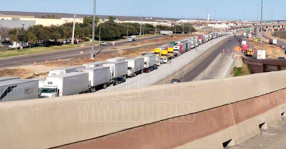 Laredo, Texas.- Imágenes que reportan filas kilométricas en la carretera de Acceso al Puente de Comercio Mundial del lado norteamericano circulan en redes sociales, mismas que son por supuestas fallas en el sistema.