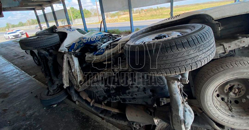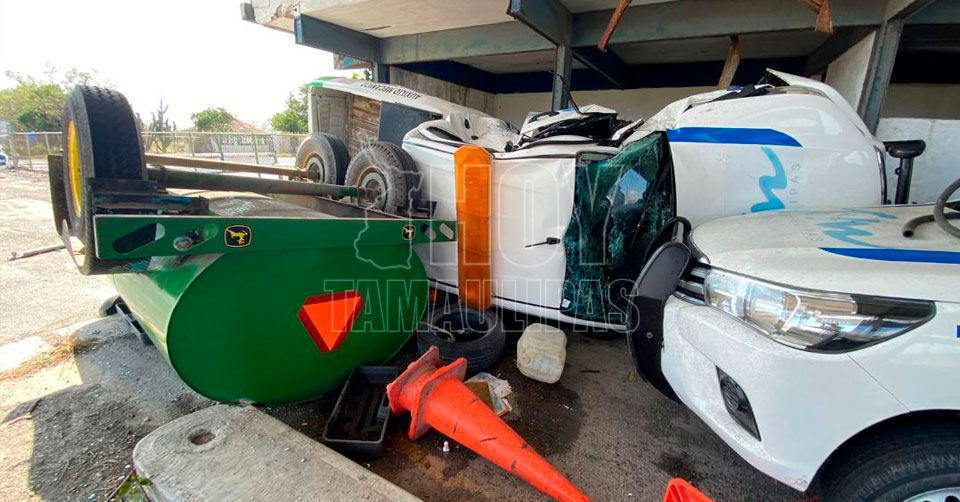 Matamoros, Tamaulipas. - Dos camionetas de Ángeles Azules Tam resultaron dañadas, una de ellas quedó volcada, luego de que un remolque cisterna con combustible se zafó de una Pick Up, color rojo, y se impactó contra ellas.
