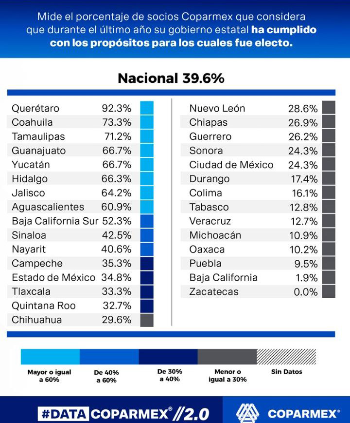 En esta ocasión, me detendré a analizar la evaluación que los empresarios agremiados a la Confederación Patronal de la República Mexicana (Coparmex) aplicaron a las 32 entidades federativas.
