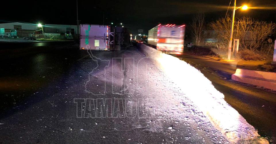 Nuevo Laredo, Tamaulipas.— Un operador de tráiler salió ileso pese a que volcó en la unidad de carga que manejaba, mientras circulaba por la Carretera Nacional, al sur de Nuevo Laredo, informó Tránsito Municipal.