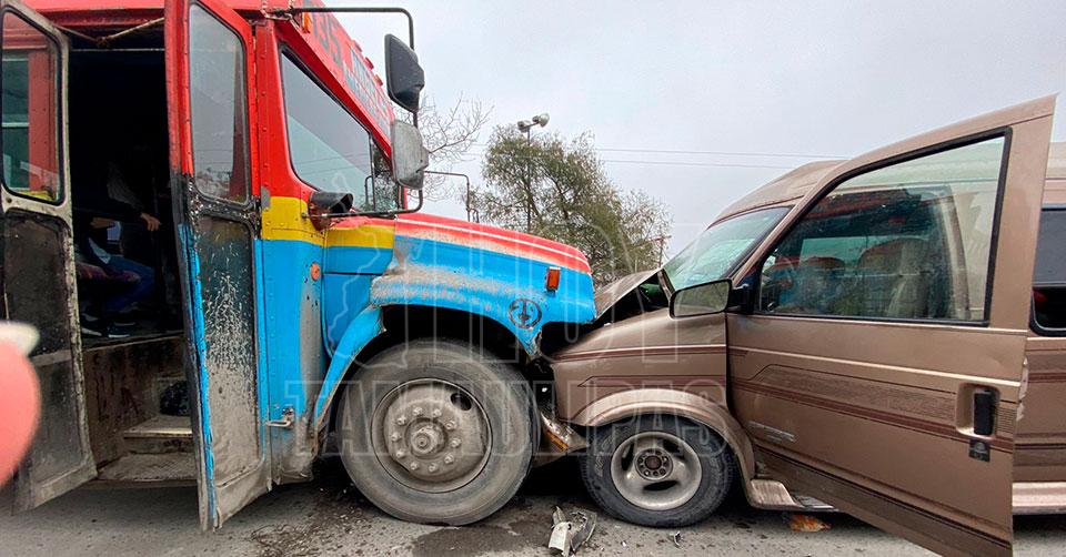 Matamoros, Tamaulipas.- Cuatro personas lesionadas fue el saldo de un choque entre un microbús de la ruta América y una camioneta GMC Safari, registrado en la calle Miguel Hidalgo y Solidaridad esta tarde.
