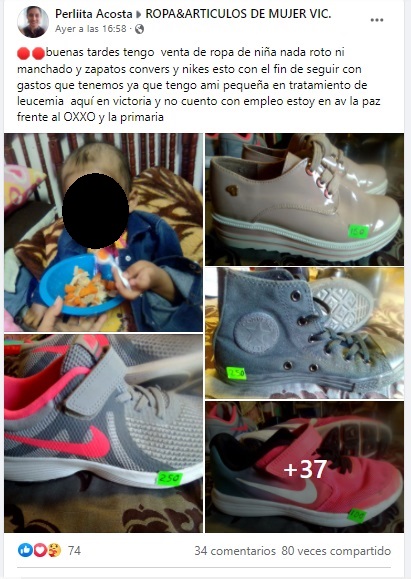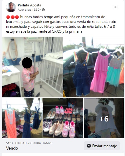 A través de grupos de ventas de Facebook Perliita Acosta ha publicado diversos artículos, como tenis, ropa, pijamas y juguetes de niña, con el fin de recaudar fondos para pagar los gastos médicos.