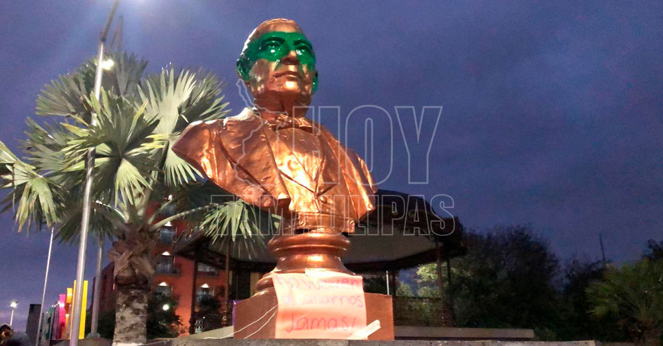 Reynosa, Tamaulipas. - Pese al llamado de las autoridades de Reynosa para que las feministas expresarán sus reclamos y demandas sin afectar el patrimonio municipal, los monumentos de personajes históricos fueron pintados.