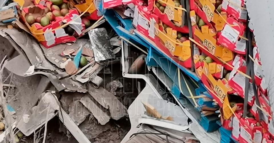 El tractocamión articulado con una caja, transportaba toneladas de mango, las cuales tras el percance “sepultaron” al chofer al romperse el contenedor.