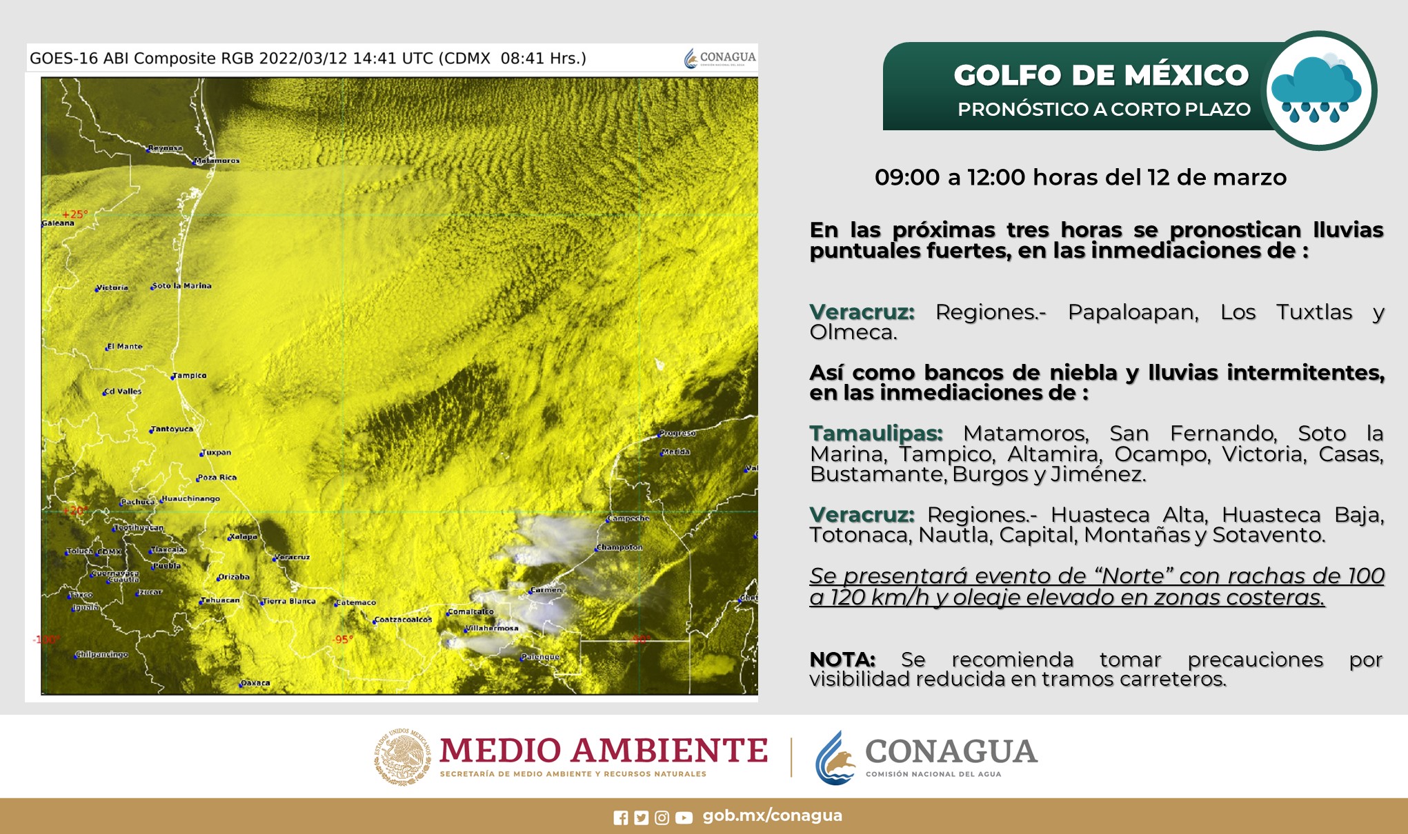 “Para esta mañana se pronostican bancos de #Niebla y #Lluvias intermitentes en regiones de #Tamaulipas y #Veracruz”, posteó la Comisión Nacional del Agua (Conagua) en su cuenta de Twitter.