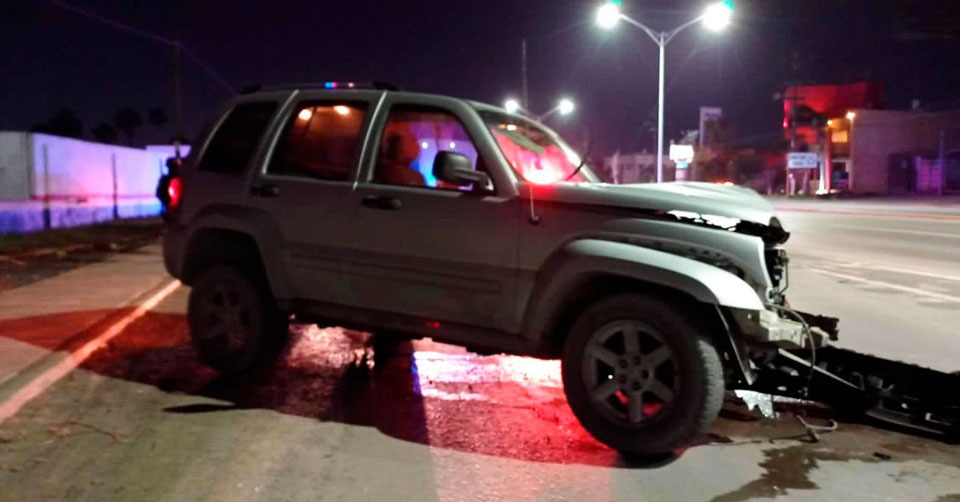 Abandonan Jeep tras chocar contra base de un señalamiento en Matamoros