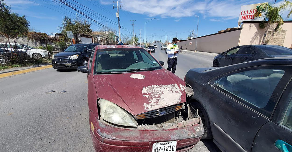 Nuevo Laredo, Tamaulipas. — Por querer dar una vuelta prohibida, un hombre de la tercera edad provocó un accidente vehicular en los alrededores del puente vehicular de la colonia 20 de noviembre, en Nuevo Laredo, en donde se registraron solo daños materiales.