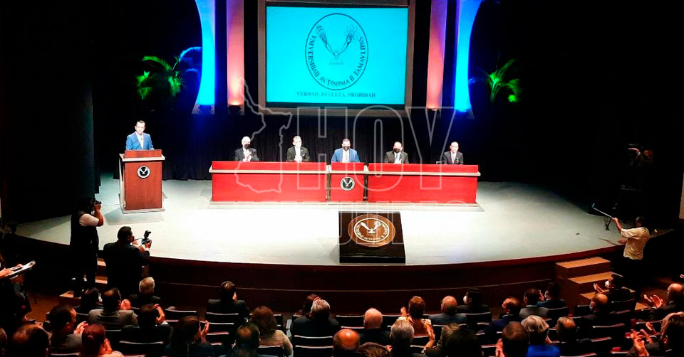 Como parte de la ceremonia, de acuerdo al orden del día de los trabajos de la asamblea de la institución educativa que renueva su órgano de gobierno, correspondió al rector de la UAT Guillermo Mendoza Cavazos tomar la protesta al nuevo director, quien alzó su brazo derecho al momento que asumía las responsabilidades y obligaciones de dirigir la Facultad de Medicina, "Dr. Alberto Romo Caballero", de la UAT para el periodo 2022-2026.